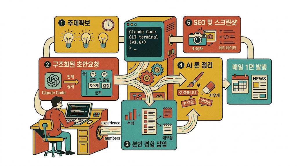 2026년 4월, 매일 블로그 1편을 발행하려면 글 쓰는 시간이 결정적 병목입니다. 저는 Anthropic의 Claude Code CLI를 중간에 끼워 초안 5분, 사람 손길 10분 구조를 만들었습니다. 이 글은 제가 2주간 운영하며 다듬은 실전 5단계 워크플로와 실측 수치입니다.