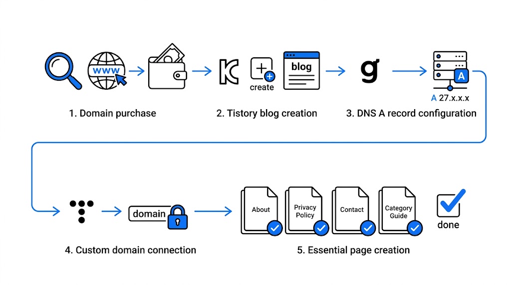 1인 창업가가 새 블로그를 시작할 때 인프라 세팅이 가장 큰 진입 장벽입니다. "도메인은 어디서 사고, 무료 호스팅은 뭐가 있고, 커스텀 도메인 연결은 어떻게 하고, SSL 은 어디서 받고..." 검색하면 5년 전 글이 섞여있고, 새 정책 반영 안 된 가이드도 많습니다. 2026년 4월 19일에 도메인 + 티스토리 블로그 + 커스텀 도메인 연결까지 1시간 안에 끝냈습니다. 그 1시간을 단계별로 정리합니다.